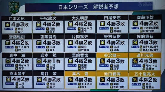 プロ野球ニュース解説者の シリーズ直前予想は 15対5で圧倒的に阪神優位だったのである。 ソフトバンク4勝1敗なんて一人もおらへん。