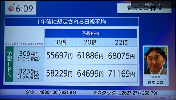 上の予想EPSに今のPER 20倍を掛けると 日経平均は 61886〜64699円となる。 さらに強気相場の時は PERが22倍になることもあり それでいくと 68075円〜71169円と 7万まで行くのである。