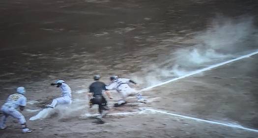 【写真】 白煙を上げてホームインする近本。ケガせんといてよ。