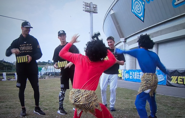 宜野座は節分恒例の 外国人選手による豆まきです。 鬼役はスポーツ紙記者の若手が務めます。